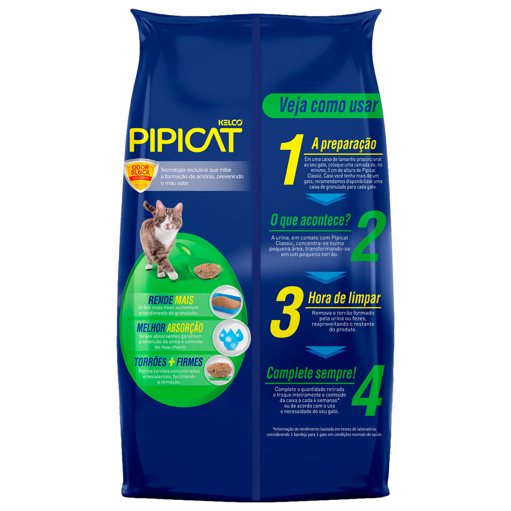 A Areia Sanitária Kelco Pipicat Classic possui grânulos médios que garantem a retenção da urina e controle do mau cheiro, além de formar torrões concentrados e resistentes que facilitam a remoção. Possui cheiro e cor natural de terra que atraem o instinto do gato.
