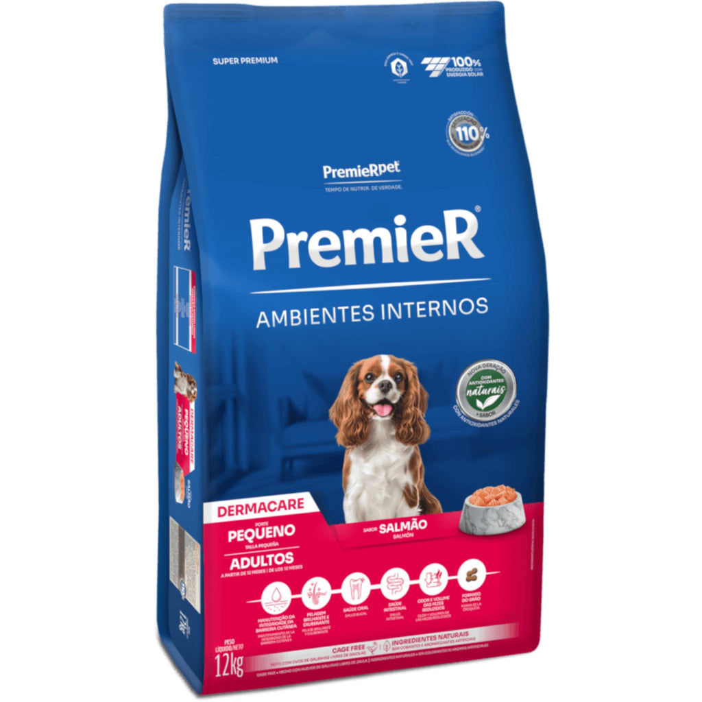 A Ração Premier Ambientes Internos Dermacare é um alimento para cães Super Premium, desenvolvido para oferecer um suporte especial para pele e a pelagem. Através da combinação de ácidos graxos essenciais (ômegas 6 e 3) e a vitamina biotina, proporciona uma pele saudável e protegida. Além disso, por ser formulado com fontes de proteína selecionadas de altíssima qualidade (salmão e ovos) e por apresentar teores elevados do mineral zinco, promove aos cães uma pelagem mais exuberante e brilhante.