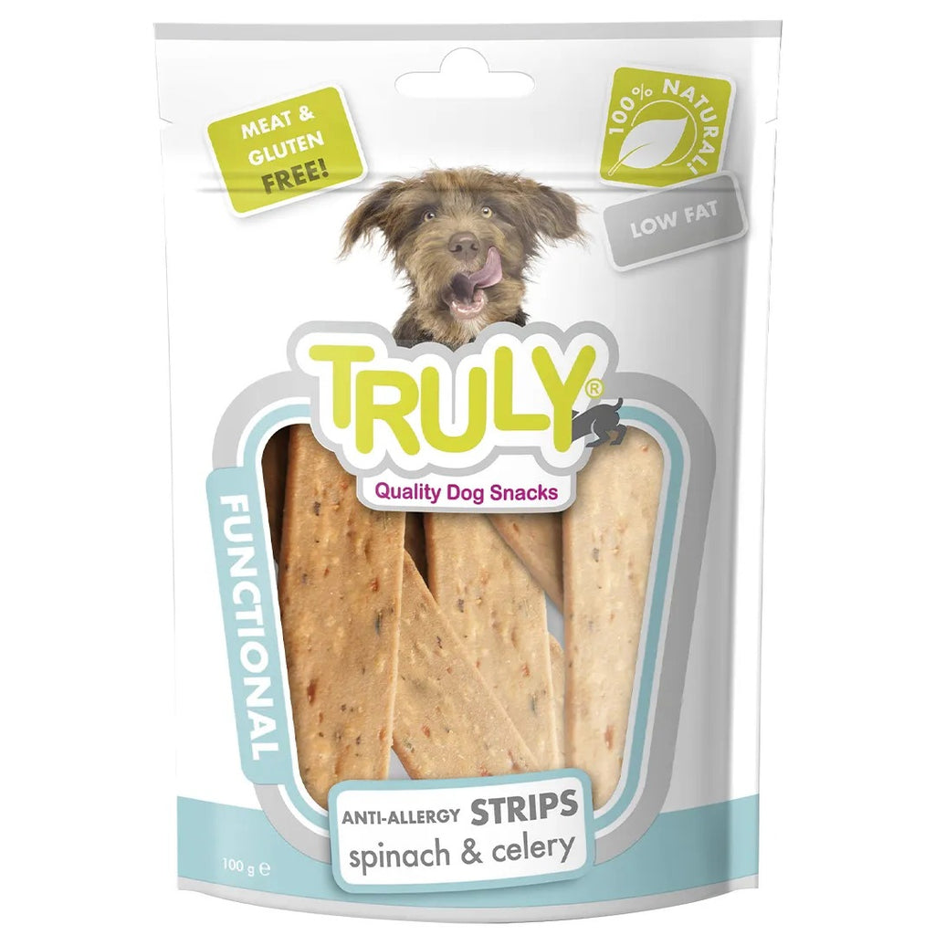 O Petisco Truly Delight tiras de espinafre e aipo, é uma opção hipoalergênica para o seu animal de estimação, totalmente livre de proteína animal.